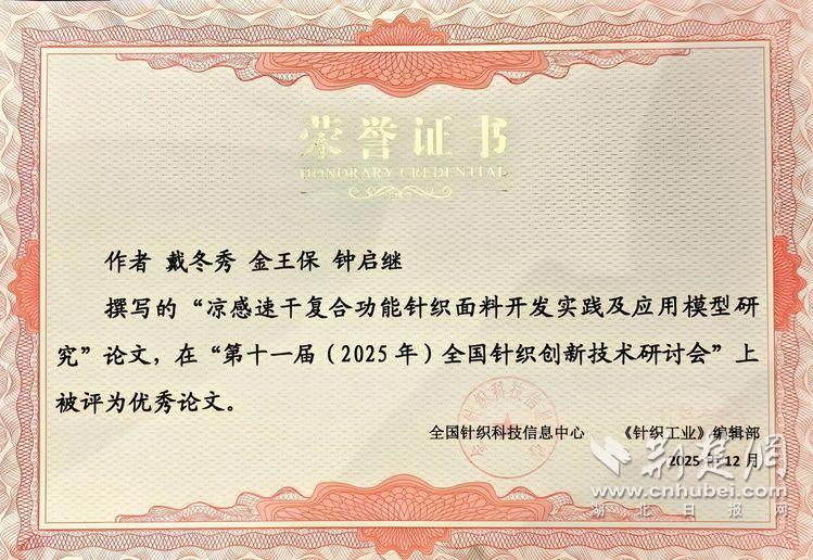 荆楚网(湖北日报网)讯(记者何鹏 通讯员娄修明、吴茜)近日,由全国针织科技信息中心与北大核心期刊《针织工业》联合主办的“第十一届(2025 年)全国针织创新技术研讨会”在上海召开。期间,武汉职业技术大学戴冬秀团队依托企业横向项目研发的科研论文《凉感速干复合功能针织面料开发实践及应用模型研究》表现亮眼,经行业权威专家评审,荣获“优秀论文奖”。