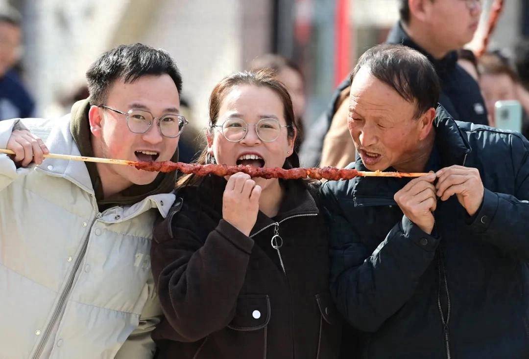 ▲2月18日,在陕西延安金延安街区,游客在品尝大串烤肉。图/新华社